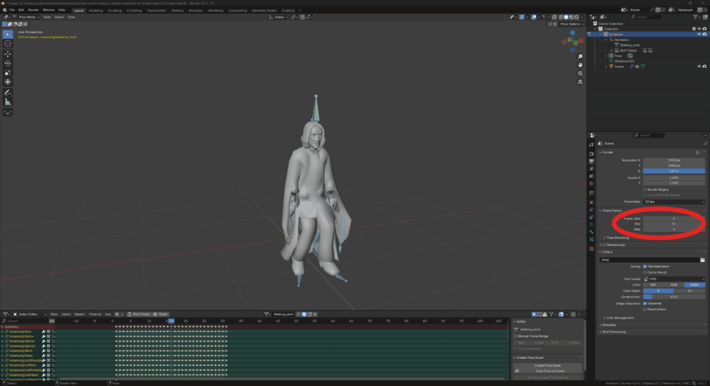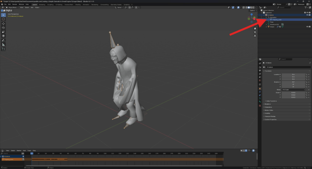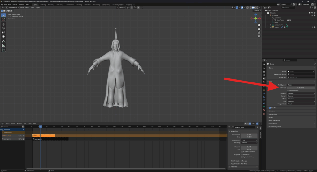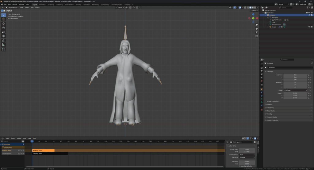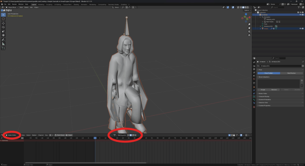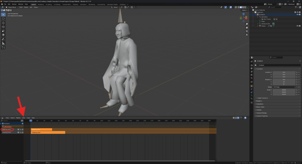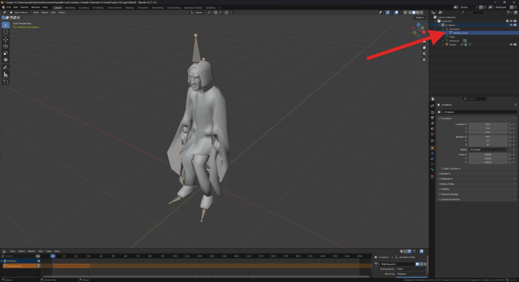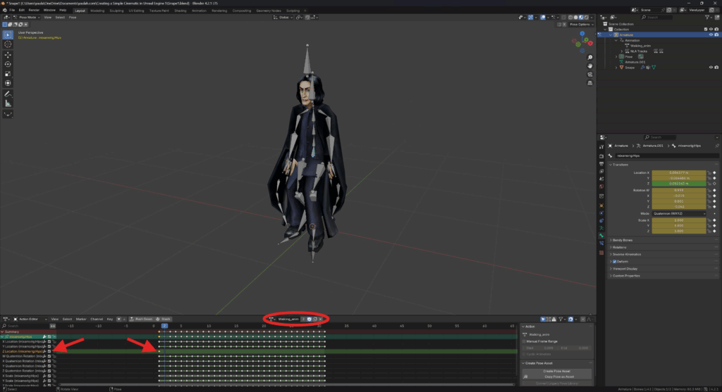 - inside the Outliner, underneath Armature / Animation, rename the animation to “Walking_anim”.