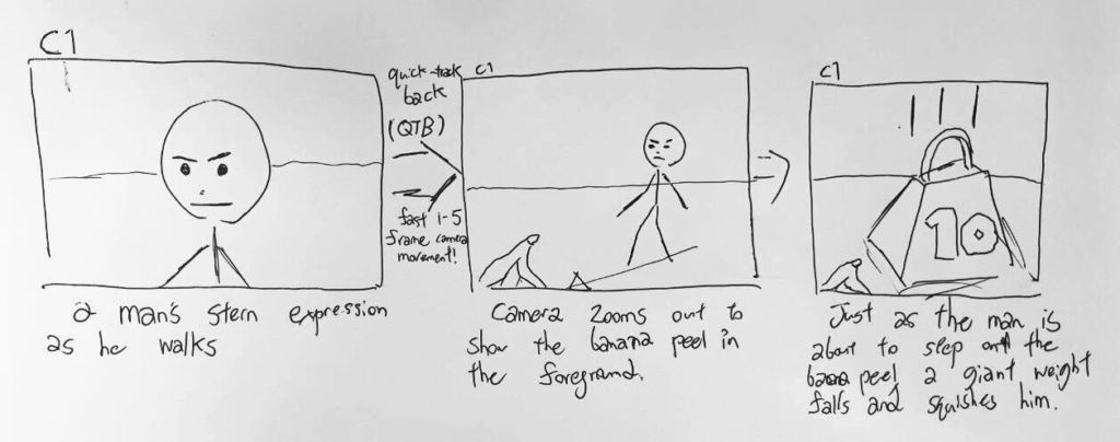 Here’s an alternative composition that hides the banana peel behind a postbox before the camera begins to pan. Although there’s still a lot to be improved here (for example, moving the camera closer to the postbox would probably look a lot more dramatic), it goes to show how a little creativity can add a lot of interest to our simple story!