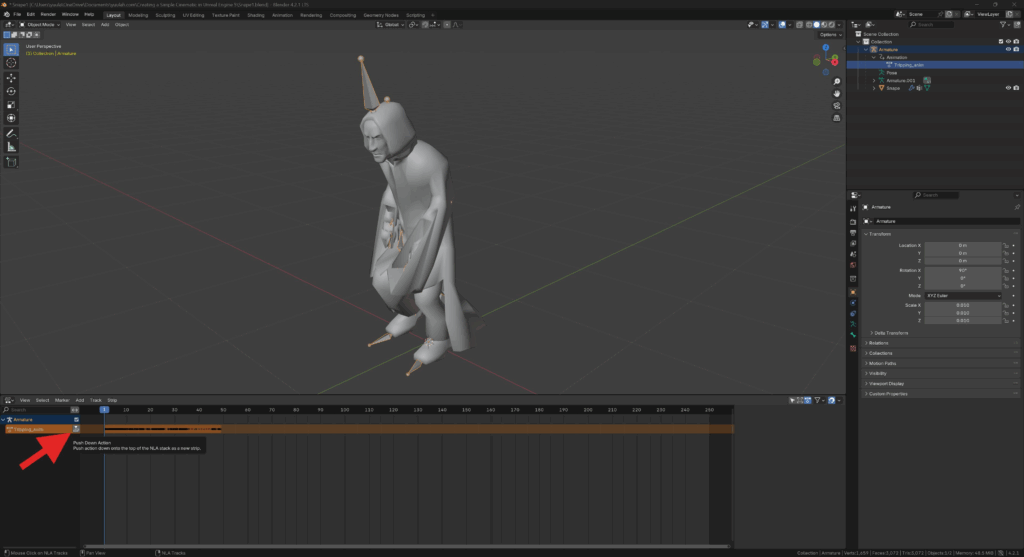 In the Tripping_anim track, hit the Push Down Action button.