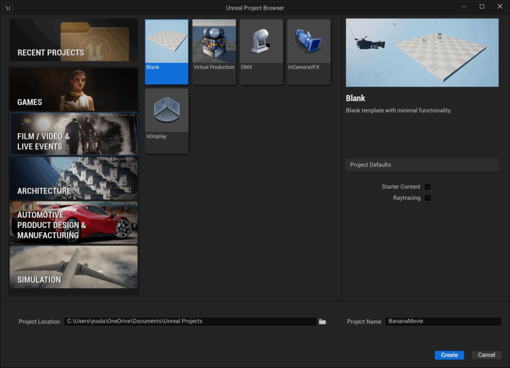 From the Film / Video & Live Events tab, I’ll create a new Blank project.