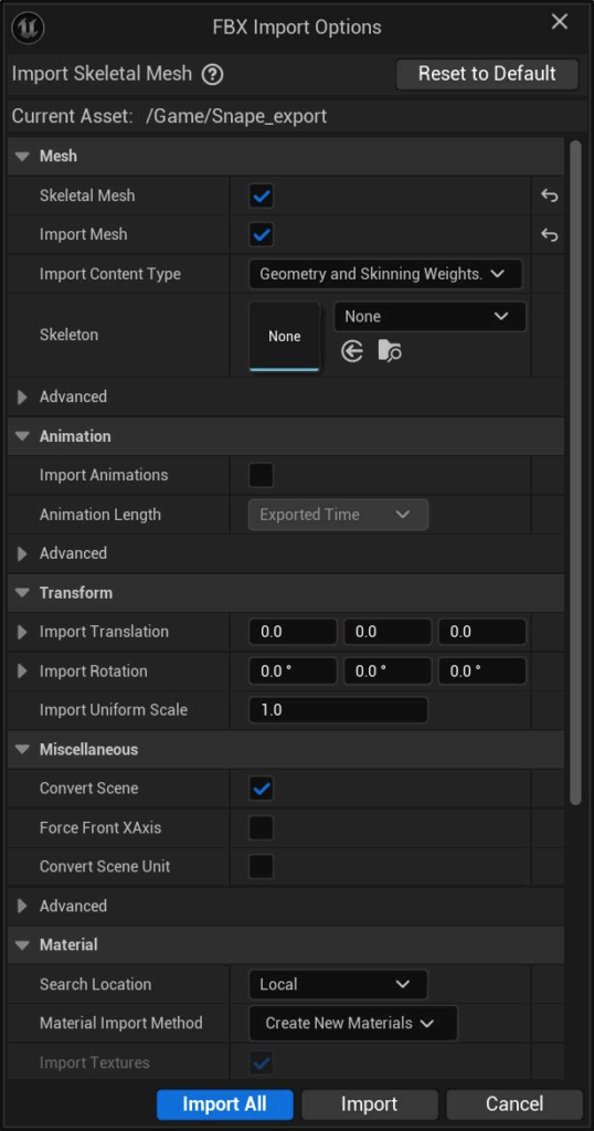 Snape_export_Skeleton) - uncheck import mesh
