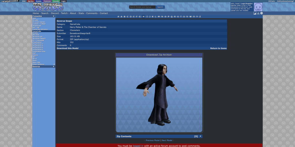 This model of Serverus Snape from the GameCube version of Harry Potter & The Chamber of Secrets look like it’ll do the job!